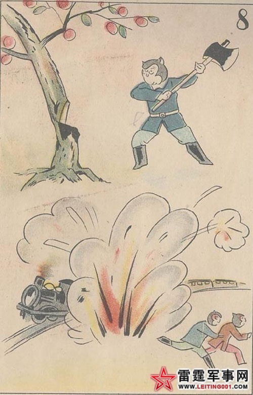 8)猴子(中国) 这样还不满足,最后竟要用斧头砍倒柿子树(炸毁日本管辖的柳条湖铁路)。(日军为侵占整个中国东北自编自演了柳条湖铁路爆炸事件,却栽赃到中国头上。)