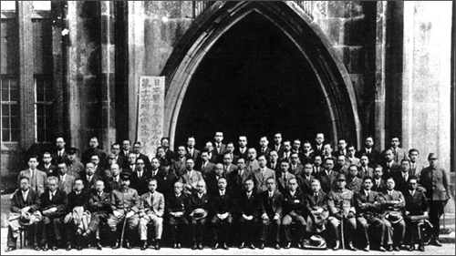 1942年日本联合微生物学会会员合影,在座均为日本细菌学研究者。前排两名军人中,左为石井四郎,右为北野政次。第三排左起第二人为南京1644部队部队长增田知贞。