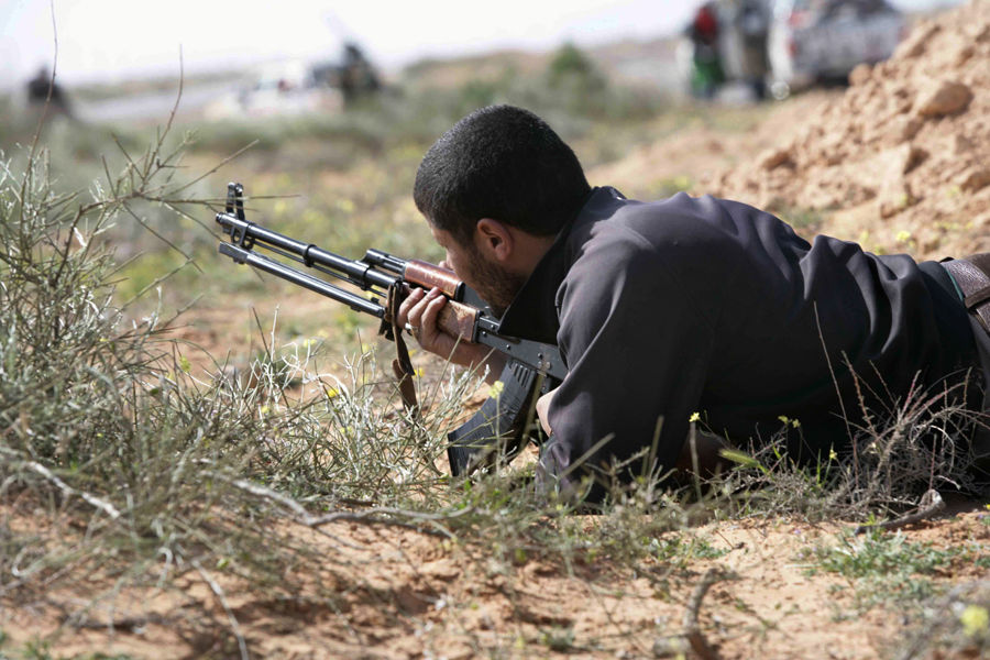 在距苏尔特120公里处,反政府武装遭到效忠卡扎菲的军队伏击。图为反政府武装成员在警戒。利比亚反政府武装向卡扎菲家乡-苏尔特推进的过程当中,遭到卡扎菲政权忠实支持者军队的伏击。据报道,这是他们一天当中第二次因为受到袭击而停止推进。