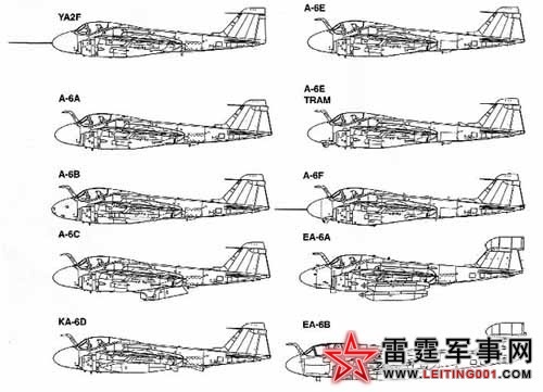 从1969年起,部分A-6A陆续被改装成其他型别。 A-6A最初装普拉特·惠特尼公司的J52-P-6A涡轮喷气发动机,单台推力37.8千牛(3855千克),后来改装了J52-P-8A,单台推力为41.4千牛(4220千克)。有4个翼下挂架和一个机身挂架,每个挂架能挂1633千克载荷。除可挂炸弹外,还可挂“小斗犬”空地导弹或副油箱。机载设备有数字式综合攻击导航系统(DIANE),可以在夜间和不良气象条件下自动导引飞机接近目标、投弹和退出。A-6A在越南战争中大量使用,其中80%的任务都是在夜间执行的。由于飞机电子设备很复杂,每飞行小时的维护工时高达90多小时,因此出勤率不高。